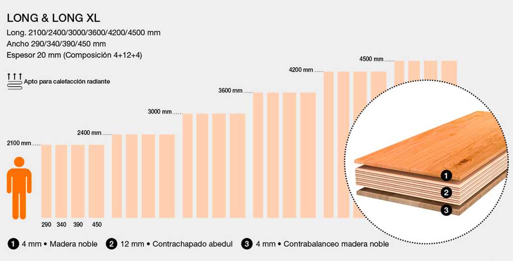 LONG & LONG XL’s thickness is 200 mm, a trilayer estructure and a French oak’s 4 mm layer. It is available between those lenghts 2.100 and 5.400 mm, with strips of 290, 340, 390 and 450 mm wide; and also in multisize conbinations where different sizes are alternated.
